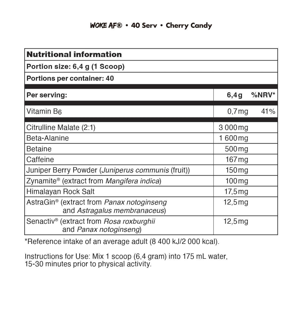 This isn't for the "I'll just do five minutes on the cross-trainer" crowd. It is designed for those who train with an intensity that borders on alarming. With a focus-driven blend that includes Zynamite® and a massive dose of Caffeine, Woke AF ensures you stay locked in from the first rep to the final, soul-crushing set. It’s high-octane fuel for the experienced lifter who wants to see their PB in the rearview mirror.